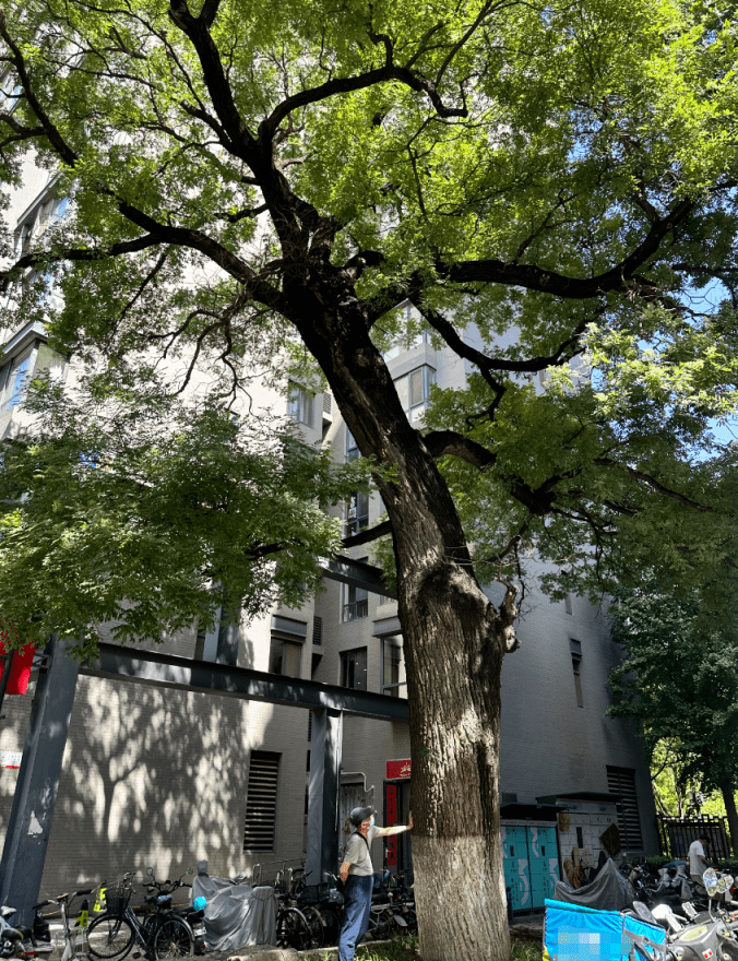 在中信锦园小区南门外,一东一西也有两棵110多年树龄的国槐。两棵古树与住宅楼距离很近,都有七八层楼高。古树周围围了一圈景观石,不少居民坐在树下乘凉。
