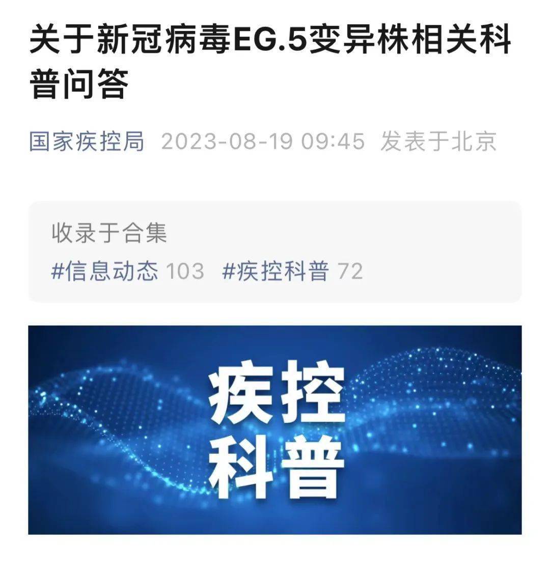 我国监测结果显示,新冠病毒流行株中EG.5变异株占比呈上升趋势,从4月的0.6%增长至8月的71.6%,目前已在我国绝大多数省份形成优势流行,未来一段时间内很可能继续保持此趋势。我国今年4—6月份经历了奥密克戎XBB系列变异株的流行,已建立的人群免疫力对同属于奥密克戎XBB亚分支的EG.5变异株仍具有免疫保护作用。近期,全国新冠疫情总体处于低水平、波浪式流行态势,疫情对各地医疗系统带来的压力较小,短期内不会发生规模性疫情。