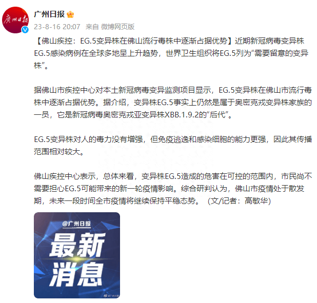 我国监测数据显示,EG.5变异株感染者与其他XBB亚分支感染者的临床分型无明显差异。近期,出现EG.5变异株流行的部分国家(例如美国、日本、韩国等)住院病例数有所增多,但没有因感染EG.5变异株导致疾病严重程度增加的报道。世界卫生组织8月9日评估认为,EG.5变异株显示出传播能力和免疫逃逸能力增强的特点,但未发现其致病力明显变化的证据,也未造成全球公共卫生风险明显增加。基于现有证据,EG.5变异株的全球风险等级被评估为低风险。