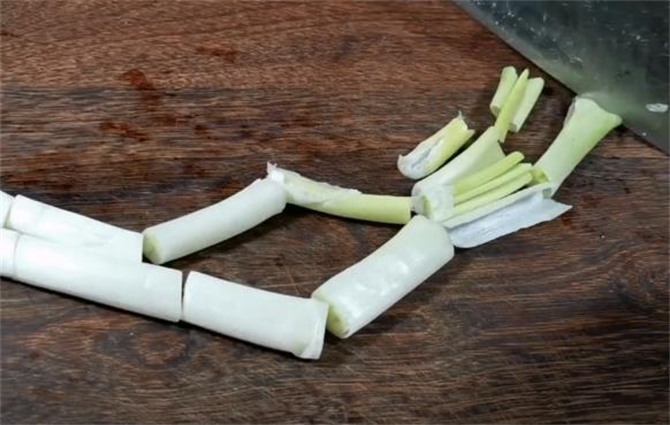 3.大葱也拍散切成段。