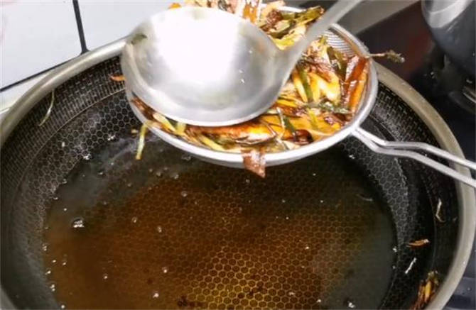 7.然后用一个细一点的漏网把残渣过滤出来,用勺子按压一下,把油分挤干。