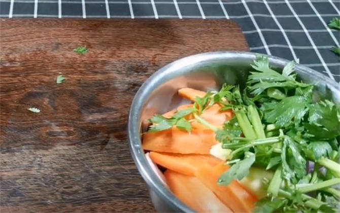 4.洋葱切成细丝,胡萝卜和生姜切成片状,芹菜切成3到4厘米长的段,全部切完以后放入盆中备用。