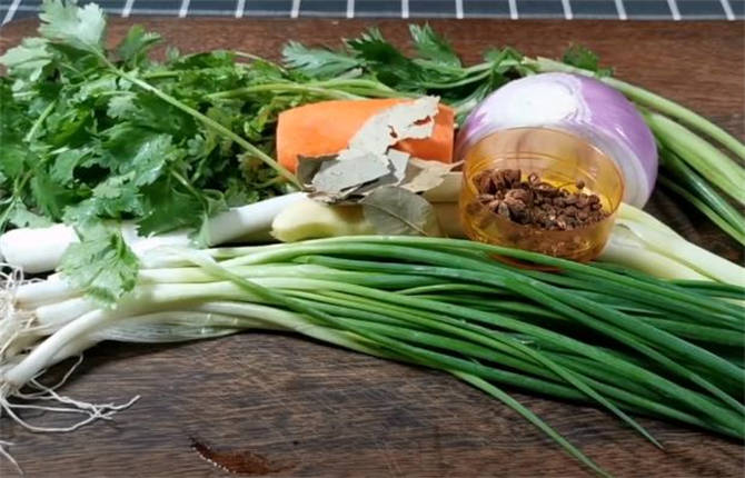 小葱、大葱、洋葱、香菜、胡萝卜、生姜、芹菜、花椒、八角、香叶、植物油