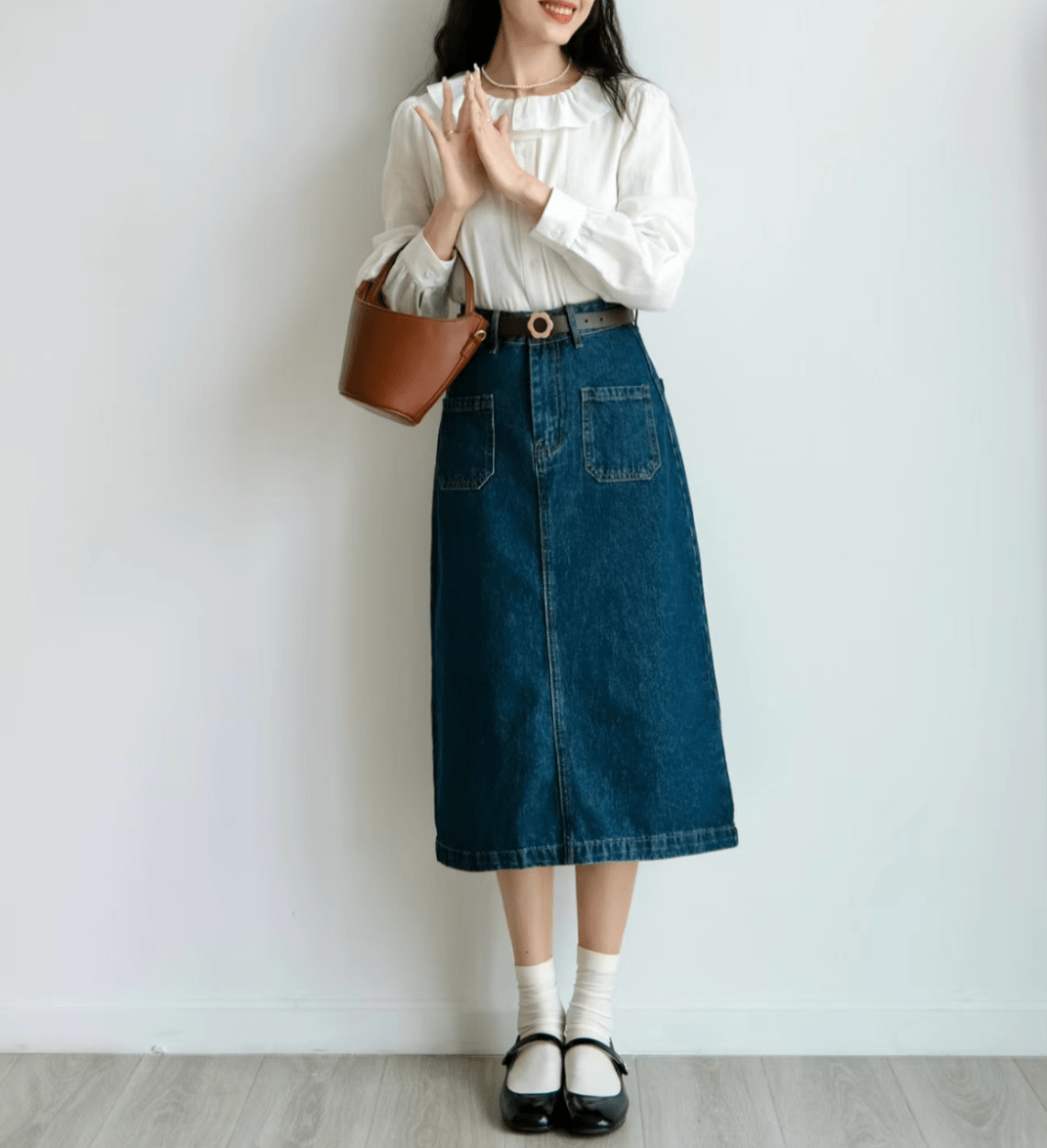 近两年比较流行的牛仔裙也可以尝试,它的特点是布料分量感十足,比较硬挺有型,适合秋冬,得体的同时又不会过分正式。