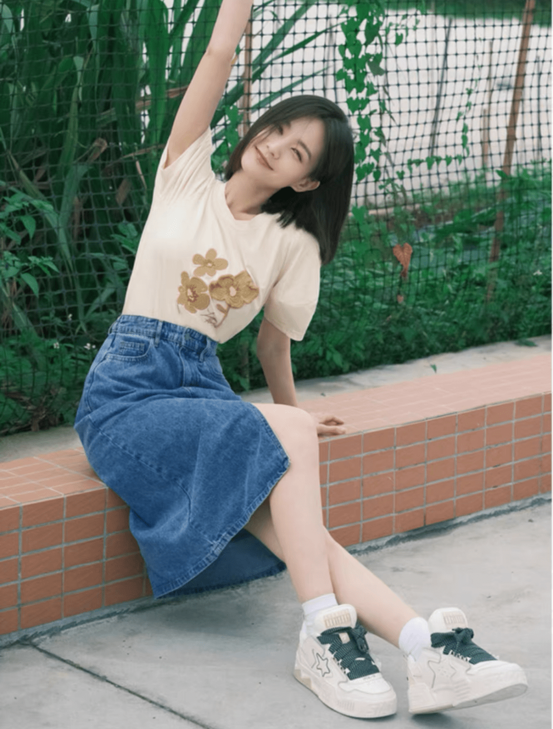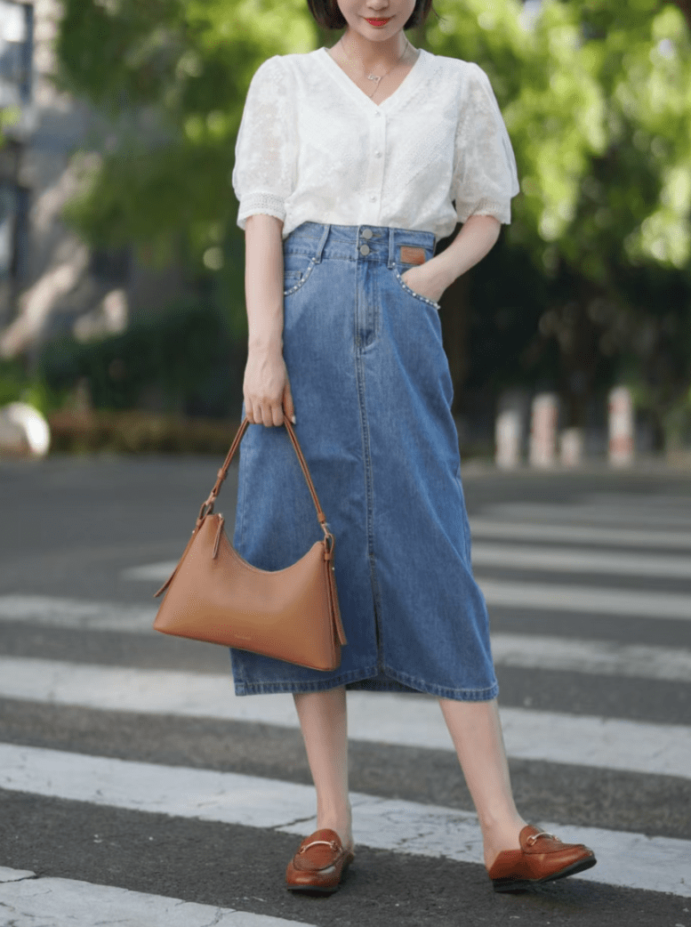 小个子选牛仔裙的话,依旧建议高腰微A版型,也可以配合一点开衩设计,配一条细腰带更好,遮胯显瘦不压身高。