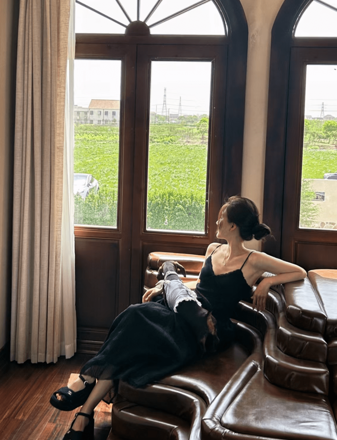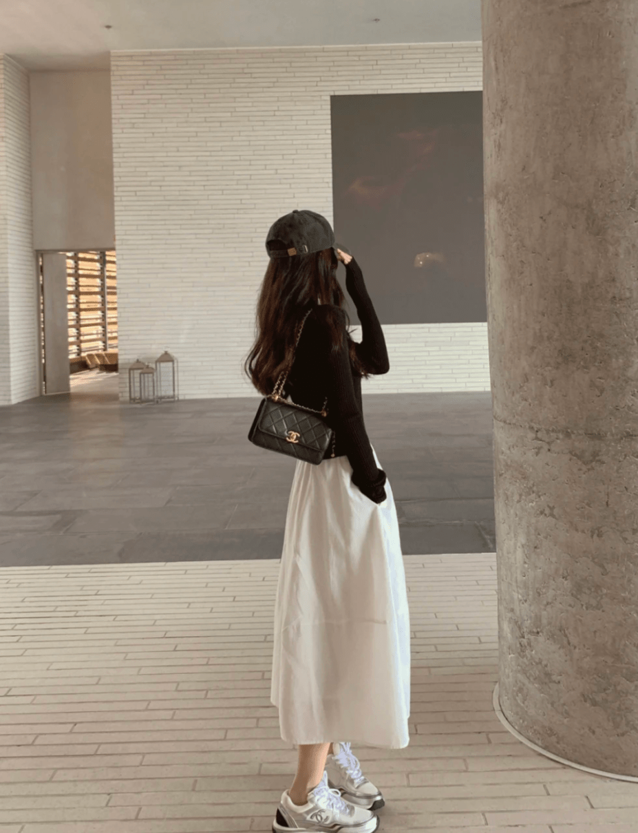 早些日子的话,穿膝盖以上的短裙还可以,但已经入秋了,气温要降不降的过渡阶段,还是长裙更合适一点。
