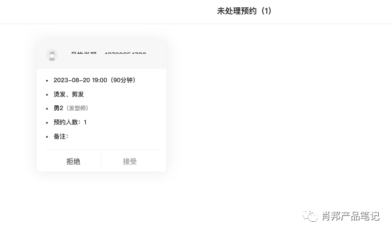 当预约接受时,这时客户和员工才会收到预约成功消息推送;当预约拒绝时,应当给会员推送一条预约失败/拒绝提示,为保证体验,商家可备注相应的拒绝原因,方便客户知晓拒绝理由。