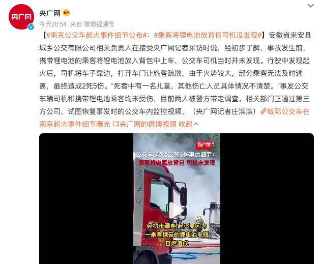 安徽省来安县城乡公交有限公司相关负责人在接受记者采访时说,经初步了解,事故发生前,携带锂电池电瓶的乘客将锂电池放入背包中上车,公交车司机当时并未发现。