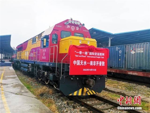 2022年10月13日,“中国天水—南非开普敦”国际班列顺利发运。这是首趟甘肃发运的中国至非洲农产品专列。李志杰 摄