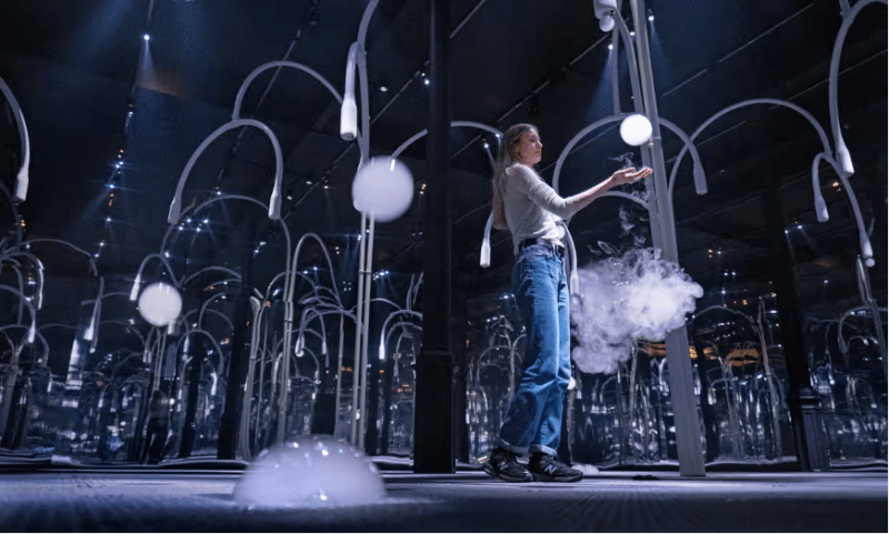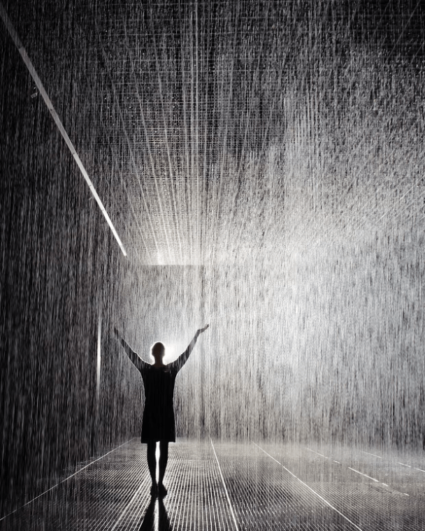 在艺术吸引力和商业化潜力的共同作用下,近年来颇有一些出色的“沉浸式展览”出现。其中的佼佼者便是兰登国际的“雨屋”。在“雨屋”之中,观众头顶是一片倾泻着“雨幕”的天花板。同时,展览空间中设置了摄像头不断捕捉观众的位置和身形,而这些数据将被用于操纵“降雨装置”:观众走到哪里,密密麻麻的“暴雨”就会在他身旁驻足。
