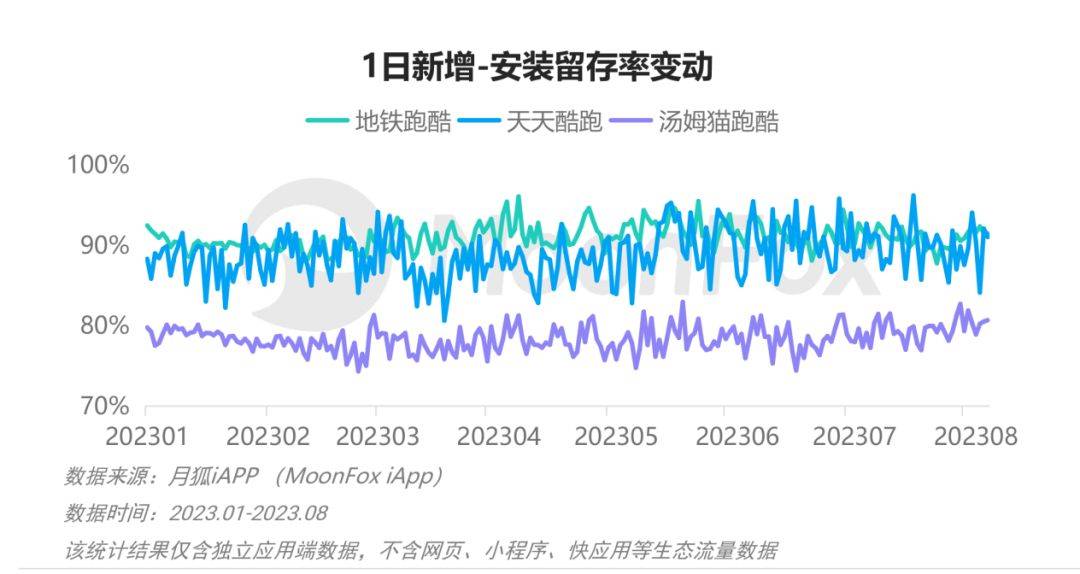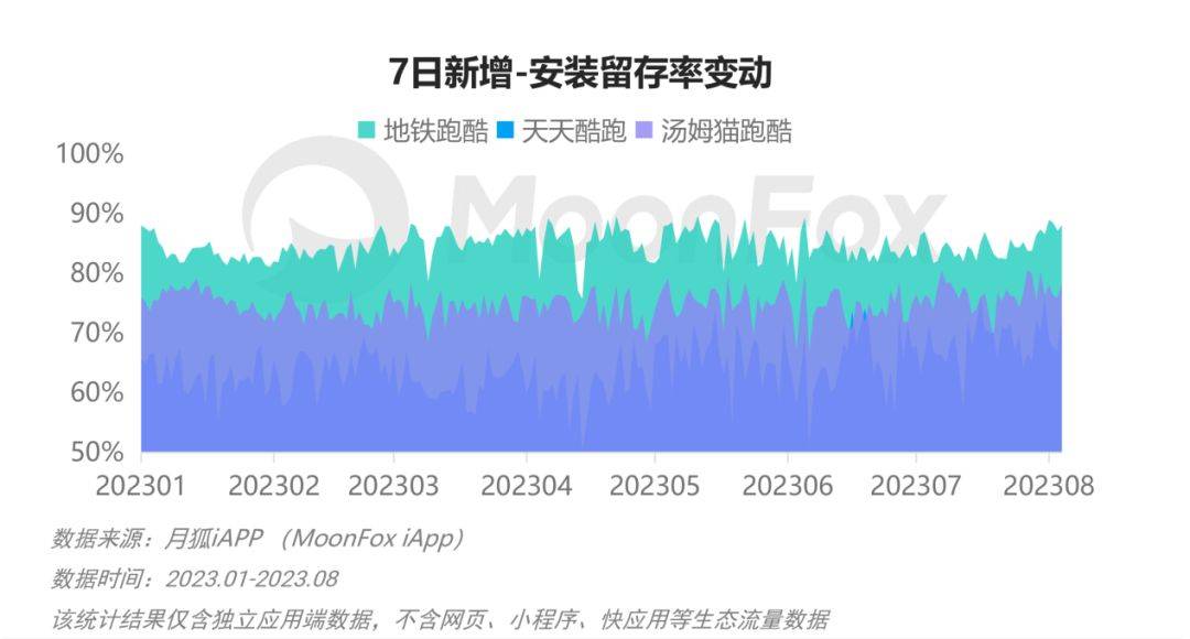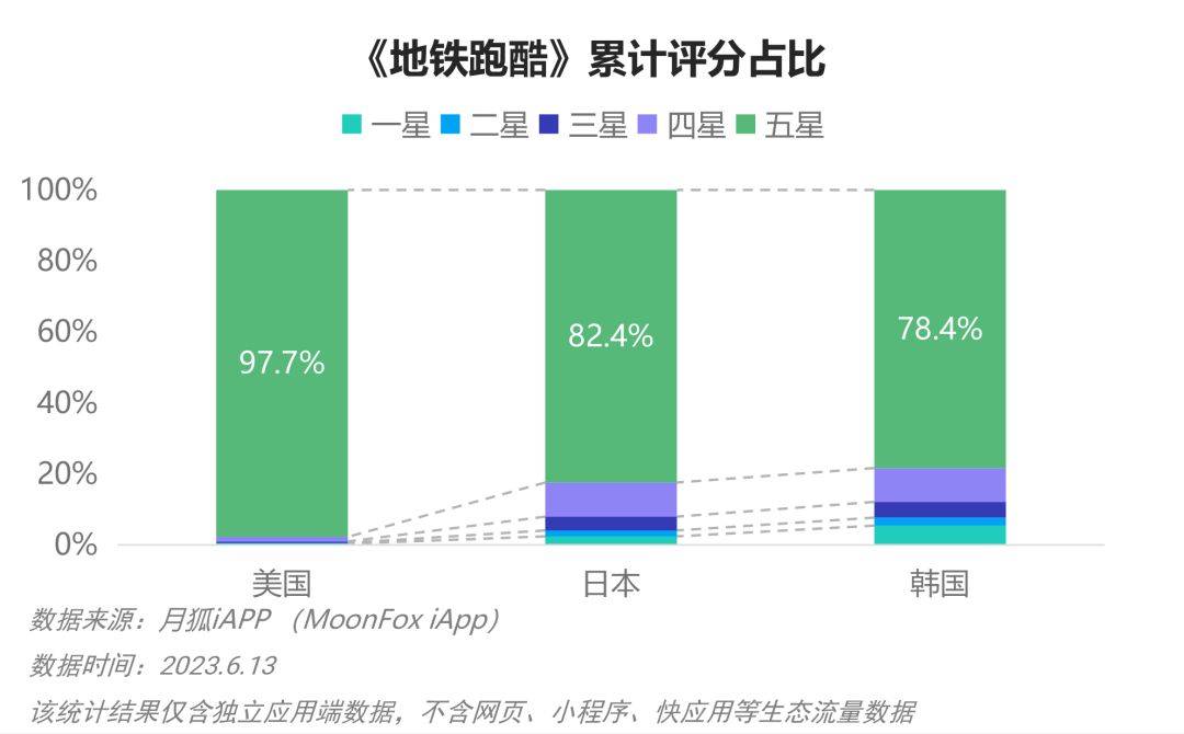 据月狐iAPP所示,跑酷竞速游戏在今年7月有9,348.96万月活跃用户,在手机游戏行业中稳居前列,且有远超50%的高留存率。其中,2023年《地铁跑酷》1日新增-安装留存率最高达到96.1%;7日新增-安装留存率远超同类游戏,最高达89.58%。这意味着即使时至2023年,《地铁跑酷》仍能出色地吸引和留住新用户,满足新用户需求与期望。同时,《地铁跑酷》海外版评分星级较高,五星级评分占比遥遥领先,在美国其五星级评分占比高达97.7%。