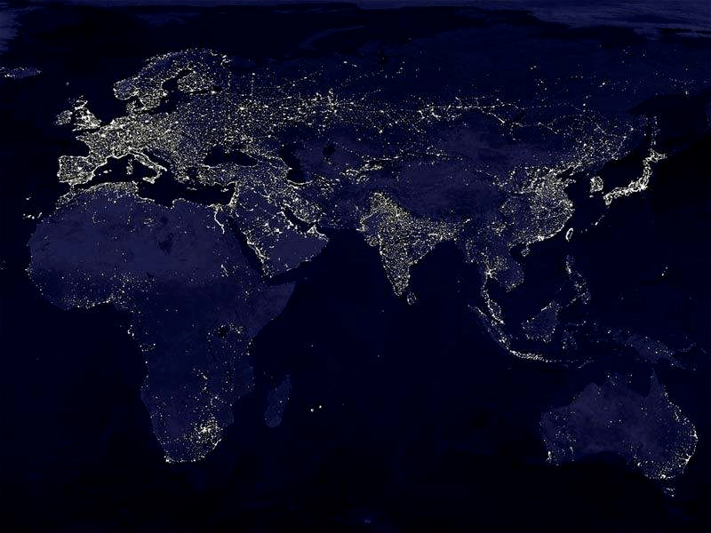 接下来就是霸王龙在地球的生存了。其实,全球人类并不是平均分布的,而是重点集中的,下面是NASA的夜景图,我们可以看到,其实人类主要集中地有限