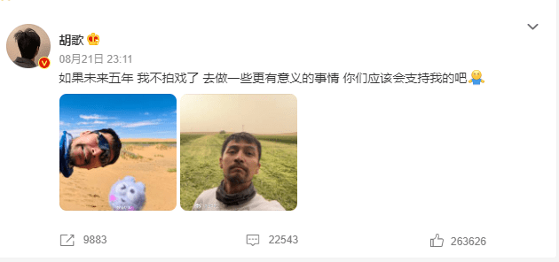 大皖新闻讯8月21日晚,演员胡歌突然在微博发文,“如果未来五年我不拍戏了,去做一些更有意义的事情,你们应该会支持我的吧。”