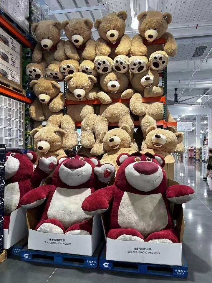这次,在杭州开市客,也有不少网红单品,天生自带流量。比如,在入口处一面墙的巨型毛绒玩具草莓熊,是来开市客必打卡的地方之一。