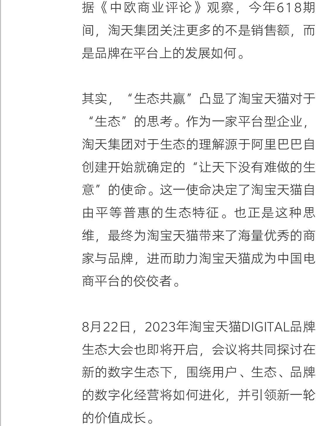 战略升级确实带来了新气象。据《中欧商业评论》观察,今年淘宝天猫618是用户参与度最高、商家参与规模最大的一届,有6000万商品参与打折,300万新品在618首发。同时,淘宝对中小商家开启全面支持,超256万名中小商家在今年618的成交额超过去年同期。今年618期间,淘天集团关注更多的不是销售额,而是品牌在平台上的发展如何。