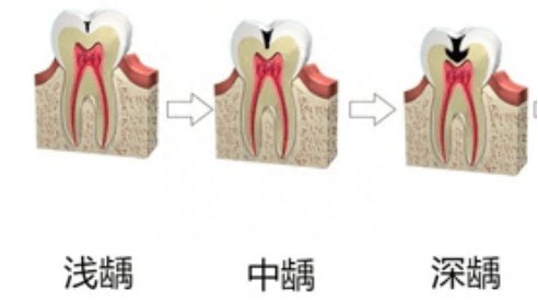 深龋:此时牙齿遇冷热酸甜刺激时敏感症状明显,检查可见较深的龋洞。容易发展成牙髓炎或根尖周炎,建议及时就诊。