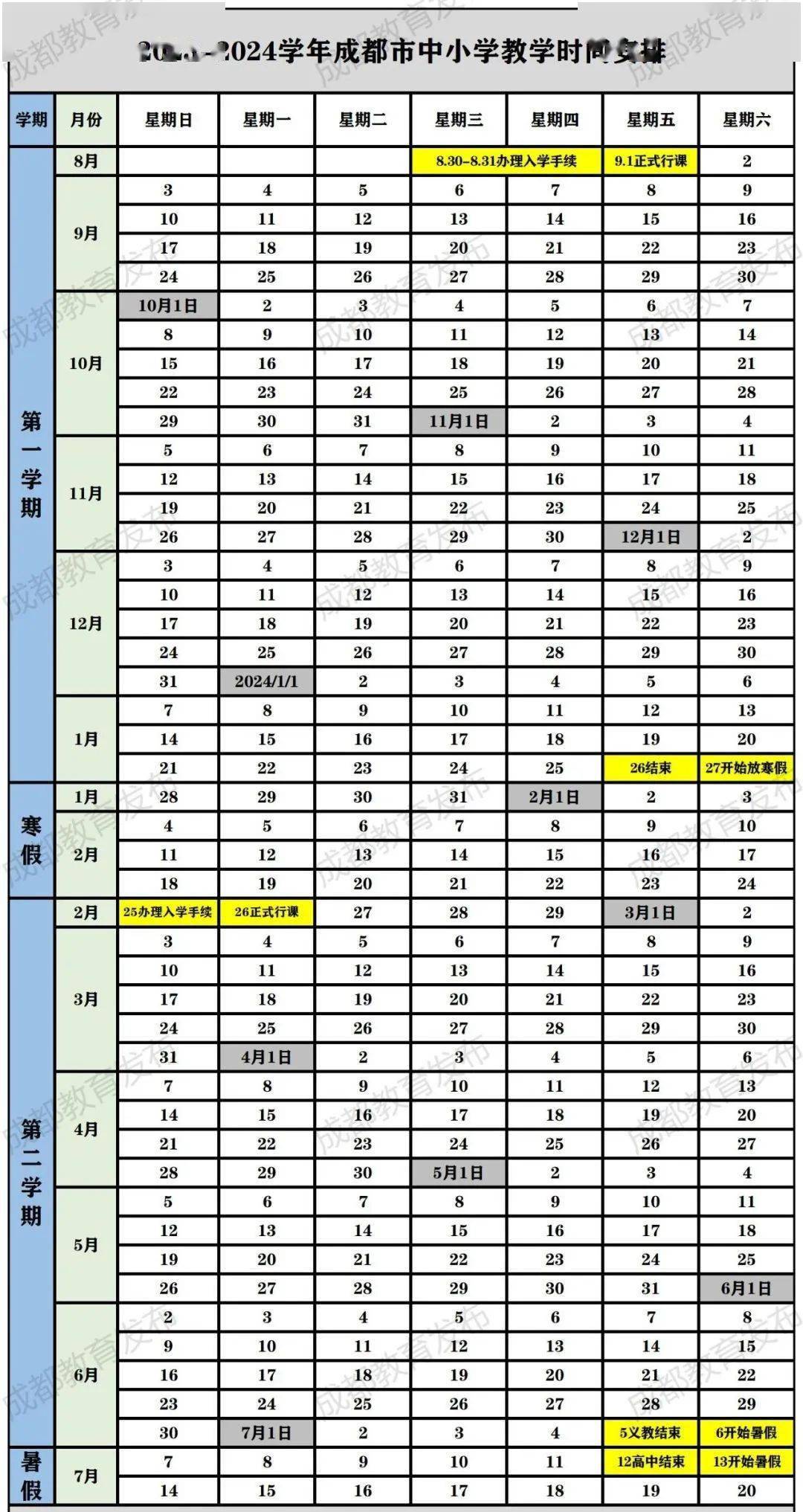 📌2023-2024学年度第一学期:2023年8月30日-31日办理入学手续,开展入学教育。9月1日正式行课,2024年1月26日结束,1月27日开始放寒假,实际教育教学共计20周。