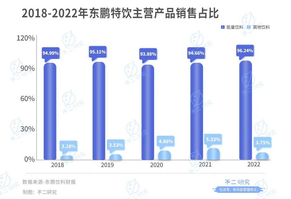 据东鹏饮料历年财报数据显示,2018-2022年,其东鹏特饮销售收入占公司总收入的比例分别为94.99%、95.11%、93.88%、94.66%、96.24%。