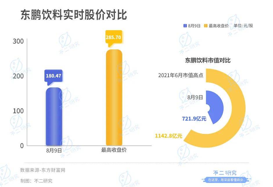 截至8月9日收盘,东鹏饮料报收180.47元/股,对应市值721.9亿元;对比2021年6月的市值高点1142.8亿元,其市值已蒸发超400亿元。