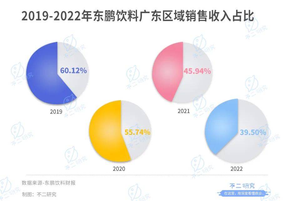 据其招股书及财报显示,东鹏饮料的销售收入主要来源于广东区域,2019-2022年,广东区域产生的收入占比分别为60.12%、55.74%、45.94%、39.50%。