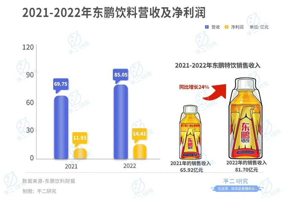 据其2022年报显示,2022年东鹏饮料营业收入为85.05亿元,相较去年同期的69.78亿元,同比增长21.89%,主要系500ml金瓶销售收入的持续提升。报告期内,净利润达14.41亿元,同比增长20.75%。