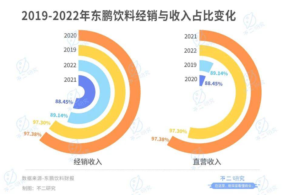 此前,在销售渠道方面,东鹏饮料过多地依赖经销商模式,而疏于自建渠道。其招股书和历年财报显示:2019-2022年,公司经销收入的占比分别为97.30%、97.38%、88.45%、89.14%,直营收入占比1.16%、0.97%、9.40%、8.64%。