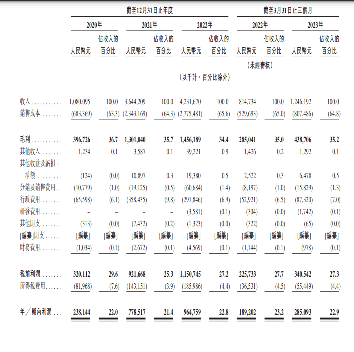 招股书显示,2020年至2022年,茶百道的营收分别为10.80亿元、36.44亿元和42.32亿元,复合年增长率为97.9%;今年第一季度,营收同比增长53%至12.46亿元。茶百道净利润分别为2.38亿元、7.79亿元、9.65亿元,年复合增长率达到101.3%;截至今年一季度,净利润达2.85亿元,同比增加50.7%。