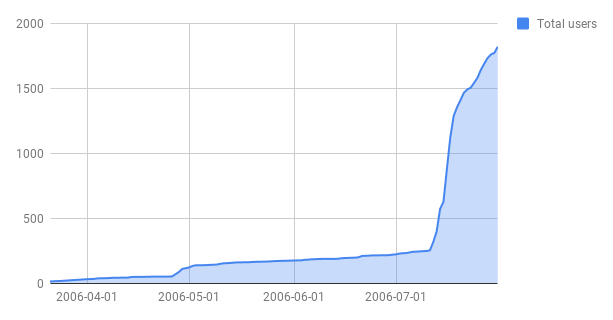 这是最初发布的每日图表。我能找到的关于该服务的第一次公开提及是在7月13日晚些时候,出现在 Evan Williams 的博客上,但你可以看到,即使在 12 日,注册也出现了小幅增长。然后是 Om Malik 在15日的帖子,真正推动了增长,随后的一天有超过 250人注册。我发现有趣的是,那时服务上的人数不到 600人,所以这是一个非常有先见之明的宣传。[…]