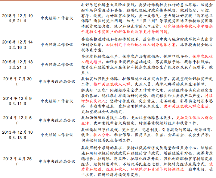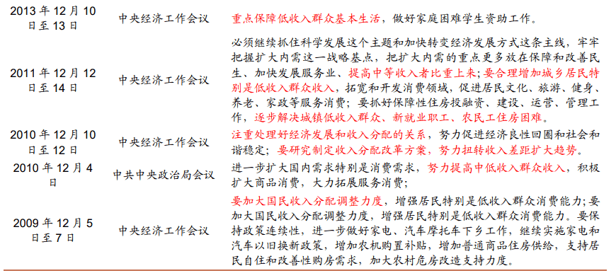 自2013年以来,我国多次在中共中央政治局会议和中央经济工作会议中提到居民“收入”,但提法多跟“收入分配”、“低收入人群”等结合在一起。但自2021年4月政治局会议开始,对居民收入的提法,与“增加”、“扩大”以及“消费”摆在了一起。具体提法包括:“增加城乡居民收入”、“通过增加居民收入扩大消费”等。而回顾历史上的政治局会议或中央经济会议,上一次这样的提法还是在2008年中央经济工作会议上。