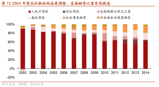 社会融资结构亟需调整,直接融资占比有待提高。虽然经济高速增长,但股市表现低迷,社会融资严重依赖间接投资,直接融资比例较低。具体来看,2002年新增人民币贷款占新增社融规模的比例高达92%,股票融资占比仅为3%;2003年新增人民币贷款占新增社融规模的比例有所下降,为81%,但股票融资并未增长,占比竟不到3%。这种的融资结构使成长型企业的壮大较为困难。一方面,前文提到彼时经济严重依赖重工业,信贷由于风险考核等原因往往将钱投入“五朵金花”等重工业领域;另一方面,重工业为主的经济结构使股票市场的行情以周期、金融为主。因此,融资结构亟需调整,解决成长型企业的融资困境。