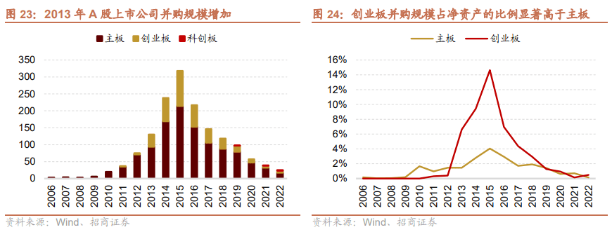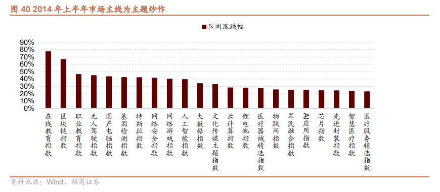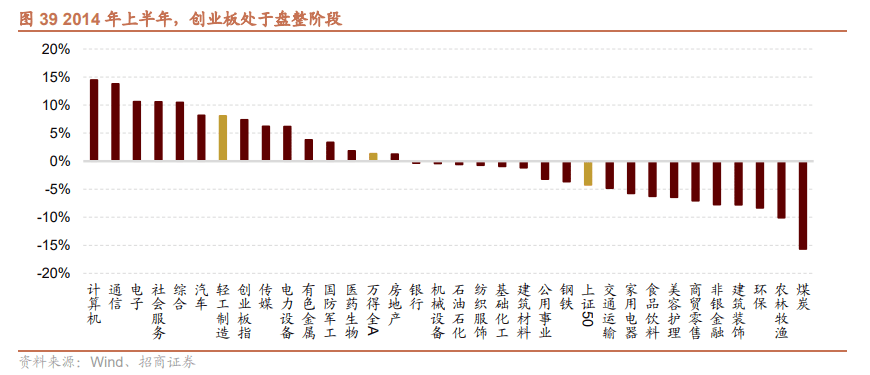 2014年上半年,创业板指涨幅仅为7%左右,处于盘整阶段,市场主线主要为概念炒作。蓝筹股在这个阶段持续表现较差,上证50在这个阶段下跌4%左右。在经历2013年上半年传媒互联网行情和2013年下半年滞涨板块补涨后,2014年上半年概念炒作成为了市场的主要特征,典型的如在线教育、区块链、无人驾驶、网络安全等主题在整个创业板的盘整期涨幅在50%左右。概念起舞的行情一方面是2013年创业板牛市特征的延续,另一方面,前面提到的并购重组规模的大幅增加功不可没。