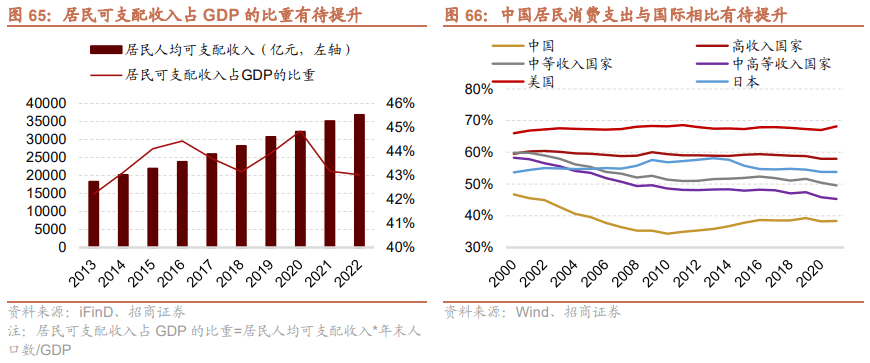 但当前居民可支配收入增长有限,消费增长有较大压力。虽然储蓄率进入长期下行的周期会对投资造成压力,但当储蓄率下行时,消费率应有所上升。凯恩斯的绝对收入消费函数表明,实际消费支出是实际收入的稳定函数。但当前的居民可支配收入增长有限,对消费的发展有一定的抑制。虽然自2010年以来,我国居民部门在可支配收入中的占比逐渐提升,但我国居民可支配收入占GDP的比重跟国际相比仍然有较大幅度的提升空间,需积极扩大居民收入,释放消费潜力。根据国家统计局数据,2009年美国、英国、德国、法国的居民可支配收入占GDP的比重分别为79.6%、67.5%、69.7%、70.1%;2008年日本的居民可支配收入占GDP的比重为63.8%。