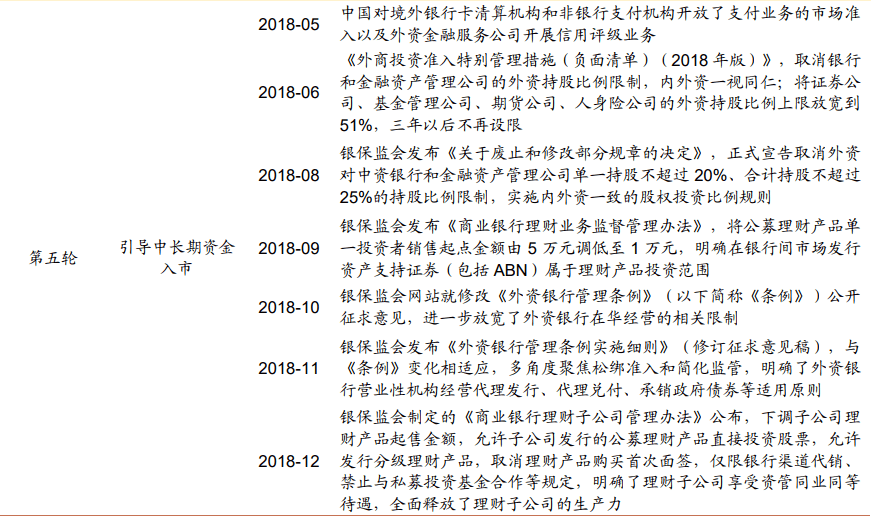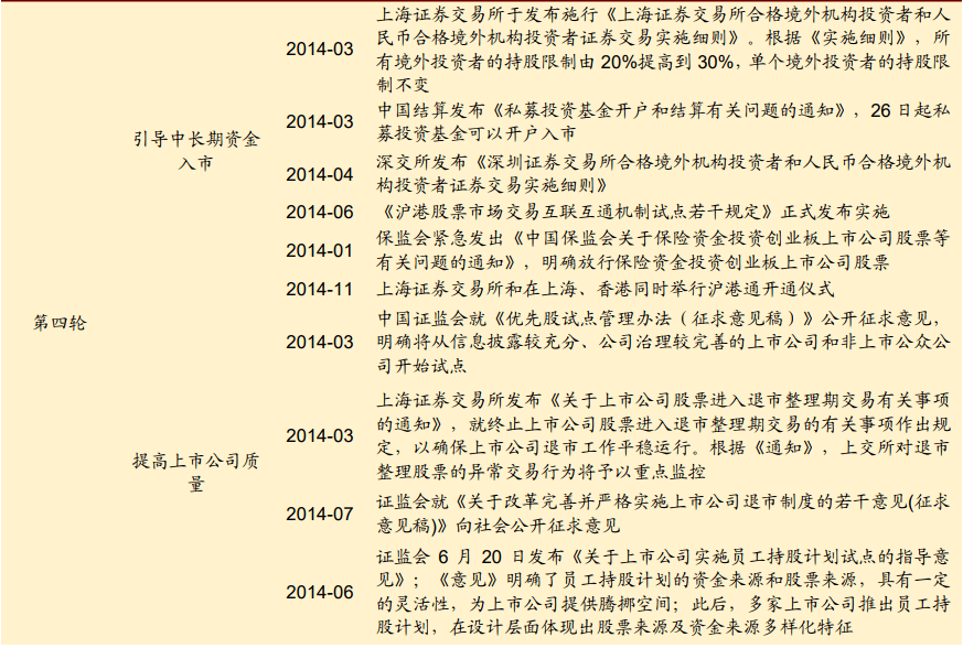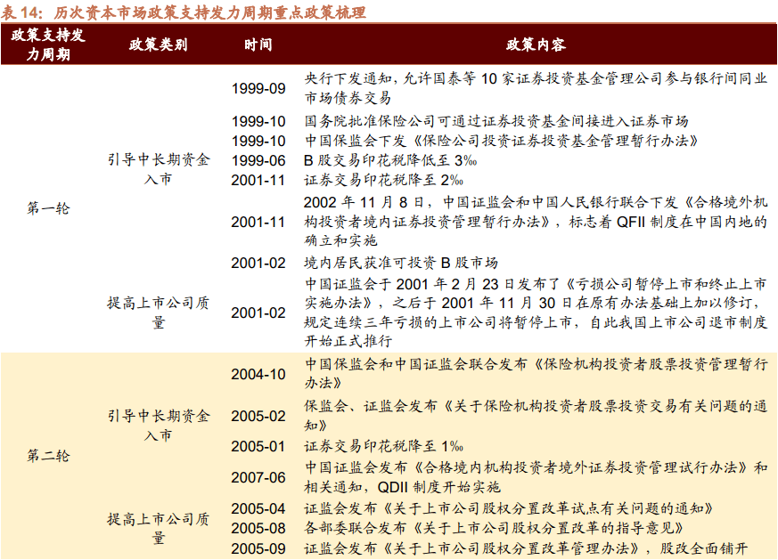 我们梳理了过往五轮政策支持发力周期的提振政策,发现政策重点主要集中在投资端的引导中长期资金入市以及融资端的提升上市公司质量上。具体来看,引导中长期资金入市的主要手段主要集中在1)调高保险等资金投资权益资产的比重;2)放宽外资投资限制;3)引入私募资金等;4)降低资金投资权益类产品投资门槛。针对提高上市公司质量的手段主要包括1)优化退市制度、2)优化回购制度、3)完善员工持股政策,辅助公司理顺经营机制等。