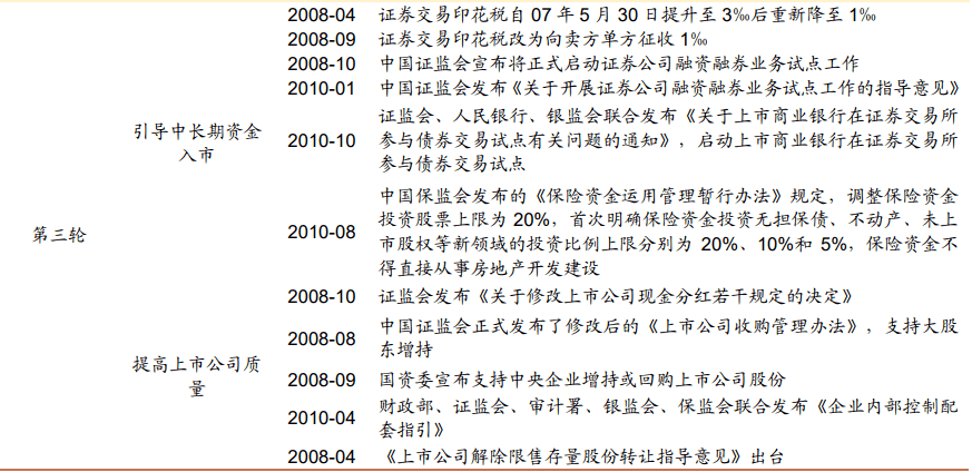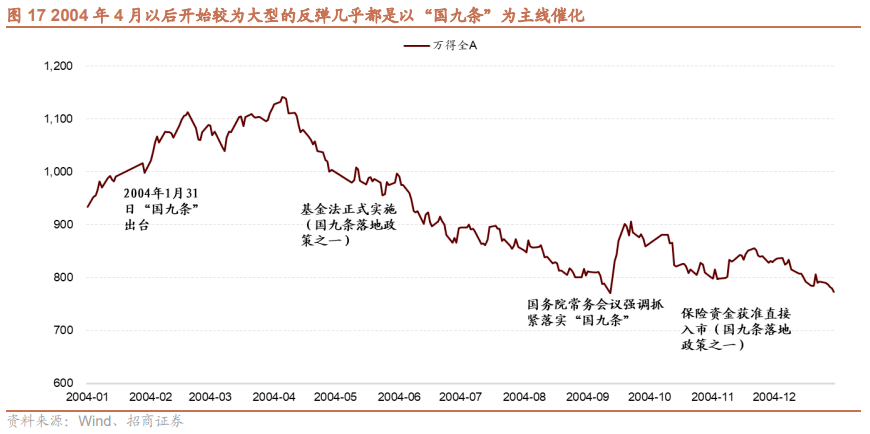 值得注意的是,即使在市场受收紧政策影响持续下行的周期里,国九条配套政策颁布还是起到了显著的短期提振作用。从历史走势来看,2004年开始,市场每次较为大型的反弹基本都是以“国九条”为主要催化。例如6月《基金法》正式实施,9月温总理讲话,强调抓紧落实“国九条”,直接促成了“914”井喷式行情。10月保险资金获准直接入市等,都足以体现出市场对该纲领性政策的重视。