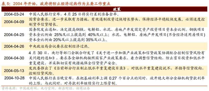 2004年政策出台后,市场不断上涨,连续上涨了两个月,但此后A股便开始进入了1年左右的下跌周期。市场在政策支持发力周期时的下跌看似不合情理,但实际上彼时市场主受遏制经济过热的政策影响。具体来看,2004年4月初开始,市场一路下跌,从开始的1783点,一路跌至2005年6月初的998点。前文提到,以投资为支点的重工业快速发展,带领经济一路高歌猛进,经济增长中枢重回10%以上。但彼时,经济呈现出过热的状态,因此,自2004年4月中央经济工作会议开始,政府的工作重点便变为了遏制经济过热。政府接连出台多项政策,严控过度投资。具体来看,3月发改委宣布原则上不再新批钢铁企业、不再审批电解铝项目;5月发改委公布《当前部分行业制止低水平建设重复建设目录》。货币政策上,4月存款准备金率提高,10月更是迎来9年首次加息。在收紧的宏观背景下,市场自2004年4月初便开始了持续的下行。
