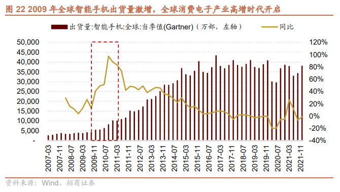 与此同时,2009年全球进入3G与智能手机时代,移动互联网的浪潮逐渐袭来,产业创新大幕拉起。2009年1月7日,工信部为三大运营商正式发放了3G牌照;而2008年6月,苹果公司的第一款支持第三方应用程序以及3G网络的智能手机iPhone3G正式发布。从数据上来看,2009年开始全球智能手机出货量激增,增速一度攀升至2010年三季度的97%,开启了全球消费电子产业高速增长的时代,同时A股新产业元年也拉开了序幕。
