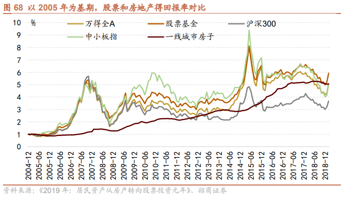 除就业外,过往增加居民收入的主要渠道为房地产。居民可支配收入可以分为工资性收入、经营性收入、财产性收入以及转移性收入,其中,财产性收入极为重要。撇开大宗商品不谈,对于居民而言,股票(权)和房子是能够方便投资的高收益高预期回报的资产。如果投资相同的钱于全部A股,全部股票基金,沪深300指数、中小板指数以及一线城市房价,2005年初净值为1,则2005年以来的净值走势图如下所示。非常清楚,在很多时候,股票和股票基金的回报超过了一线城市房子。巧合的是,截止2019年3月底,自2005年以来A股整体,中小板指和一线城市的回报率非常接近,均为5倍涨幅。沪深300要稍微差一点,而股票基金有明显的超额收益。