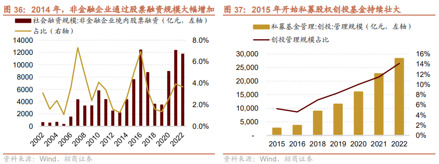 直接融资比重迅速增长。“新国九条”指出要“提高直接融资比重”、“建立健全私募发行制度,发展私募投资基金”。2014-2016年间,非金融企业通过股票融资规模迅速增长,2016年达到1.2万亿元,占当年社融规模的7%,成为历史高点。此外,私募股权投资基金也在不断壮大,为中国新兴产业发展贡献了不小的力量。