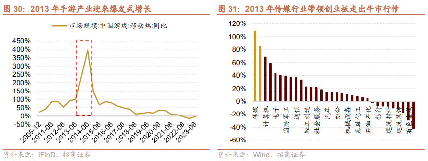 但到了2013年,不利因素消除,十八大提出支持文化产业发展,叠加移动互联网时代的兴起,2013年“手游”市场爆发,引领传媒板块暴涨。2013年全年,传媒板块累计上涨108%,进而带动整个创业板迎来牛市,全年上涨84%。而这一切的起点都要归功于2009年创业板的推出。
