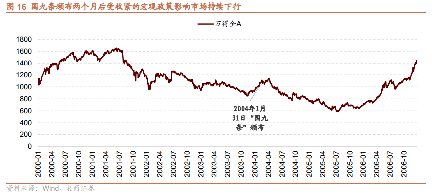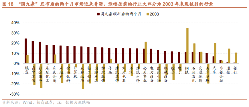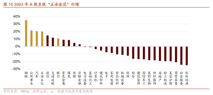 2004年政策出台前,在高投资增速驱动经济增长的宏观背景下,2003年A股市场表现出了著名的“五朵金花”行情,即以钢铁、电力、汽车、能源、银行为主线的蓝筹股行情。2003年全年这几个行业涨幅居前,全年分别上涨35%、21%、20%、20%、10%。