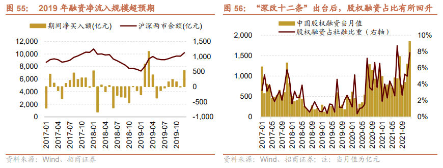 “深改十二条”出台后,伴随各项后续举措密集落地,从融资结构、投资市场信心和对外开放多个方面,资本市场释放出利好信号。融资结构方面,科创板融资功能被充分挖掘,科创板作为沟通科技创新企业和资本市场资金配置的桥梁,“深改十二条”推行一年以来,科创板上市公司数由29家上升至173家,2020年股权融资占比明显大幅提升,资本市场更好地服务于实体企业融资。2018-2019年的一系列利好政策,提振个人投资者信心。2019年,两融标的流入创下2015年以来年度净流入规模的最大值。全年沪深两市融资余额10193亿元,融资资金累计净流入110635亿元,相比2018年融资净流出明显大幅改善,净流入规模超市场预期。对外开放层面,“深改十二条”系列举措强化外资进入国内市场通道便利性,吸引更多境外资金入市,股权融资占比持续攀升。