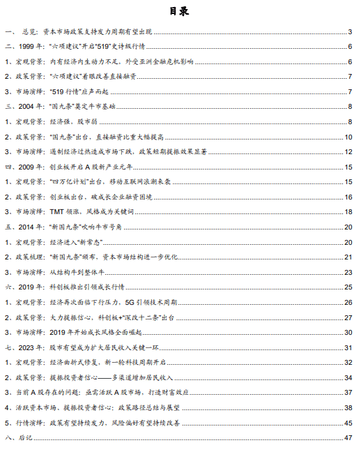 股票市场是资本市场的重要组成部分,历来受到国家的重视。总结过往规律来看,国家对资本市场的支持也呈现周期性规律,1999年的“六项建议”得到批准、2004年的中小板推出与“国九条”发布、2009年创业板推出、2014年的“新国九条”发布、再到2019年科创板推出以及“深改十二条”,我们发现每隔五年左右的时间,或者推出新的板块或者高层级发布重要的支持资本市场的文件,把资本市场提到重要的位置,与此同时,A股表现也将会进入相对不错的状态。