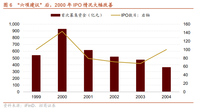 “六项建议”的推出,有效地将社会储蓄转为长期投资,以满足不同市场主体的投、融资需求,引导民间资金流向政府鼓励的项目和符合国家产业政策的领域,拉动经济增长。2000年,IPO数目创历年新高,该年数目超过了140家,募集金额超过了900亿元,充分体现了“六项建议”对社会主体融资的积极引导作用。