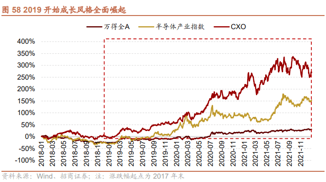 而进入2019年,宏观经济再次面临下行压力,中美贸易摩擦升级冲击着投资者信心;但此时,科创板即将开板,叠加A股又迎来了新一轮技术支持周期。因此,2019年开始,价值风格告一段落,成长风格全面崛起,科技半导体、医药的CXO,涨幅最大,持续时间最久。