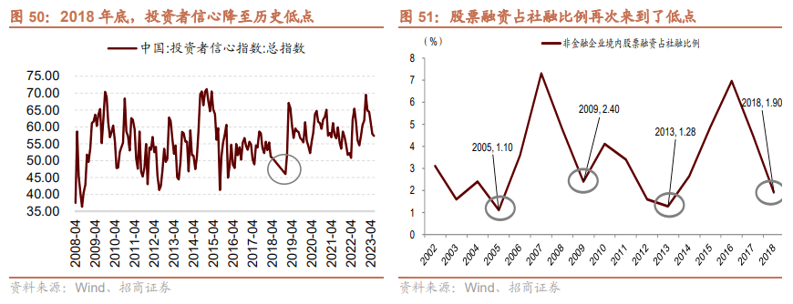 在这样的背景下,2018年底,投资者信心接近历史低位,股权融资占比再次低迷。具体来看,2018年底证券投资者信心指数为46,低于当时历史平均水平的54。非金融企业境内股票融资规模占总社融规模的比例也再次降到了2%以下,上次低于2%还是2013年(1.28%)。