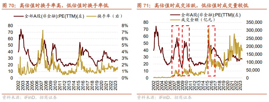 A股市场存在比较明显的趋势交易特征。从历史数据来看,在历次股市大涨推升A股估值处于较高位置时,整个市场的成交量和换手率也大幅提升,说明投资者入市积极,市场成交活跃。相反,连续的调整使A股估值总体下滑至较低位置时,投资者往往偏谨慎,整个市场成交相对低迷,换手率低,市场流动性承压。这就导致股市交易过度时出现“非理性繁荣”,而股市调整时投资者加速逃离,对本身较为优质标的也会造成冲击。