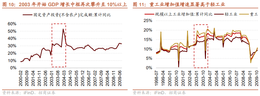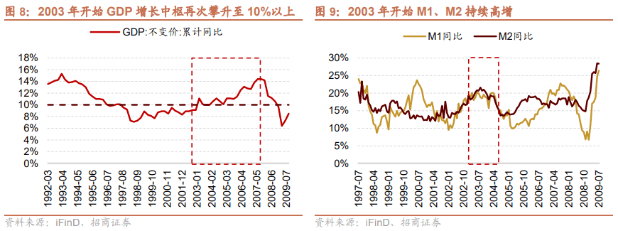 与1999年的内外交困背景不同,本轮政策支持发力周期是在经济高速增长时期提出的。2000年以后,中国经济处于持续扩张的态势,GDP增速在2003年开始再次步入10%以上的增长中枢,同时,货币投放持续加速。2003-2004年6月左右,M1、M2持续维持近20%的增速。固定资产投资一片火热。2003年,固定资产投资增速一度达到了53%的历史高峰;分行业来看,重工业增加值显著高于轻工业。2003年重工业增加值增速为18.6%,显著高于轻工业增加值增速的14.6%,拉高了整体工业增加值增速到17%。