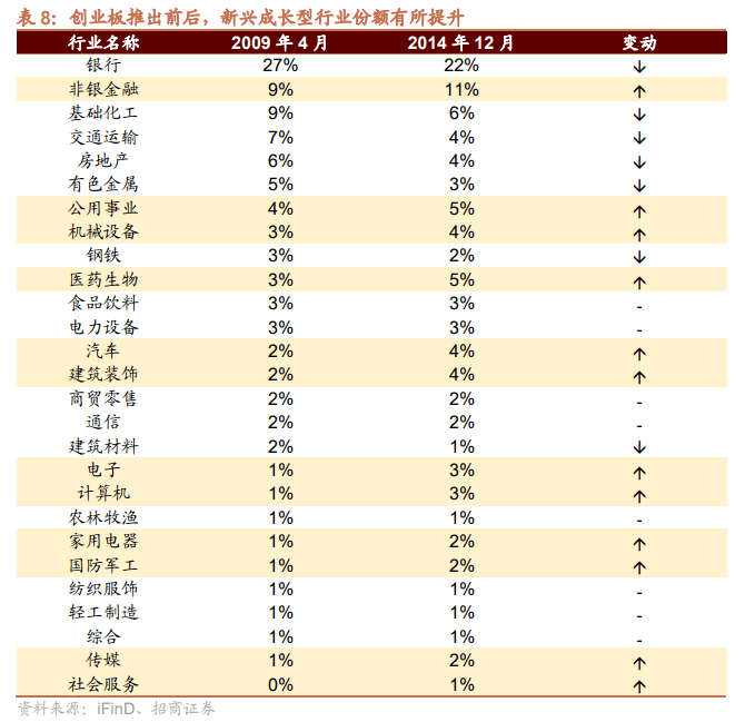 创业板主要为支持新兴产业融资,创业板推出后,新兴成长型产业在A股市场的市值占比快速攀升。具体来看,《暂行办法》明确提出,创业板的推出是为了“促进自主创新企业及其他成长型创业企业的发展”。从创业板出台之前资本市场的行业结构来看,市场整体以金融、周期、地产为主,成长型企业占比较小。2009年5月1日前,申万行业中, TMT+医药的新兴行业市值占比仅为8%,对新兴产业的支持亟待提升。创业板推出后新兴产业市值占比迅速提升,到2014年TMT+医药的行业市值占比已经攀升至15%,累计增长7%。