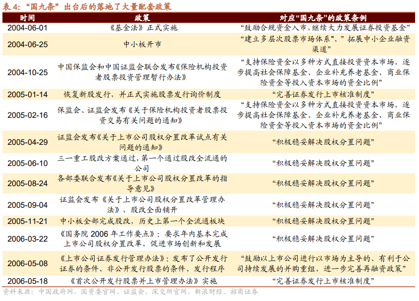 国九条发布后一直到2006年6月前后,相关配套政策陆续落地,资本市场迎来了政策支持发力周期。具体来看,2004年6月,《基金法》正式实施,证券投资资金大力发展;2005年2月,《保险机构投资者股票投资管理暂行办法》发布,保险资金大量入市;2005年4月,《关于上市公司股权分置改革试点有关问题的通知》发布;8-9月《关于上市公司股权分置改革的指导意见》以及《上市公司股权分置改革管理办法》,股权分置全面铺开;2006年5月《上市公司证券发行管理办法》发布,鼓励已上市的企业并购重组。