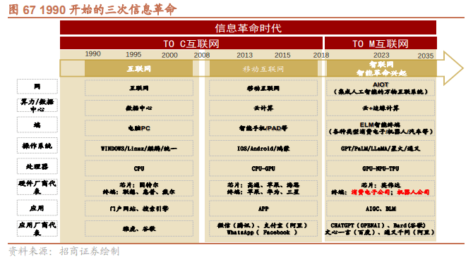 此外,进入2023年,以大语言模型为主的信息技术革命正驱动全球进入新一轮科技周期。2022年11月,基于GPT3.0的语言预训练模型的应用ChatGPT发布,一经发布,其良好的使用体验使得ChatGPT迅速走红,用户量大幅度攀升。成为一款基于大语言模型的爆款应用产品。除此之外,微软公司将GPT4.0嵌入BING搜索,使得BING搜索的用户量短期内大幅攀升,成为第一款因为内置了大语言模型的传统应用。BING的用户量提升又带动了Edge浏览器用户的提升,对Google浏览器和Google搜索带来了巨大的竞争压力。当以大模型为代表的人工智能加速进化,BLM软件、ELM智能终端逐渐丰富和成熟,云端计算和边缘计算相辅相成,与互联网、移动互联网、物联网等组成一个完整的网络体系,就是AIOT网络。AIOT网络就是涵盖人类和各种智能硬件的超级网络,这个超级网络的构建和完善就是信息科技革命的核心。当前大语言模型正加紧开发中,未来随着信息科技革命持续推进,随着技术的进步以及集中爆发,将带来大科技革命中的小科技周期。